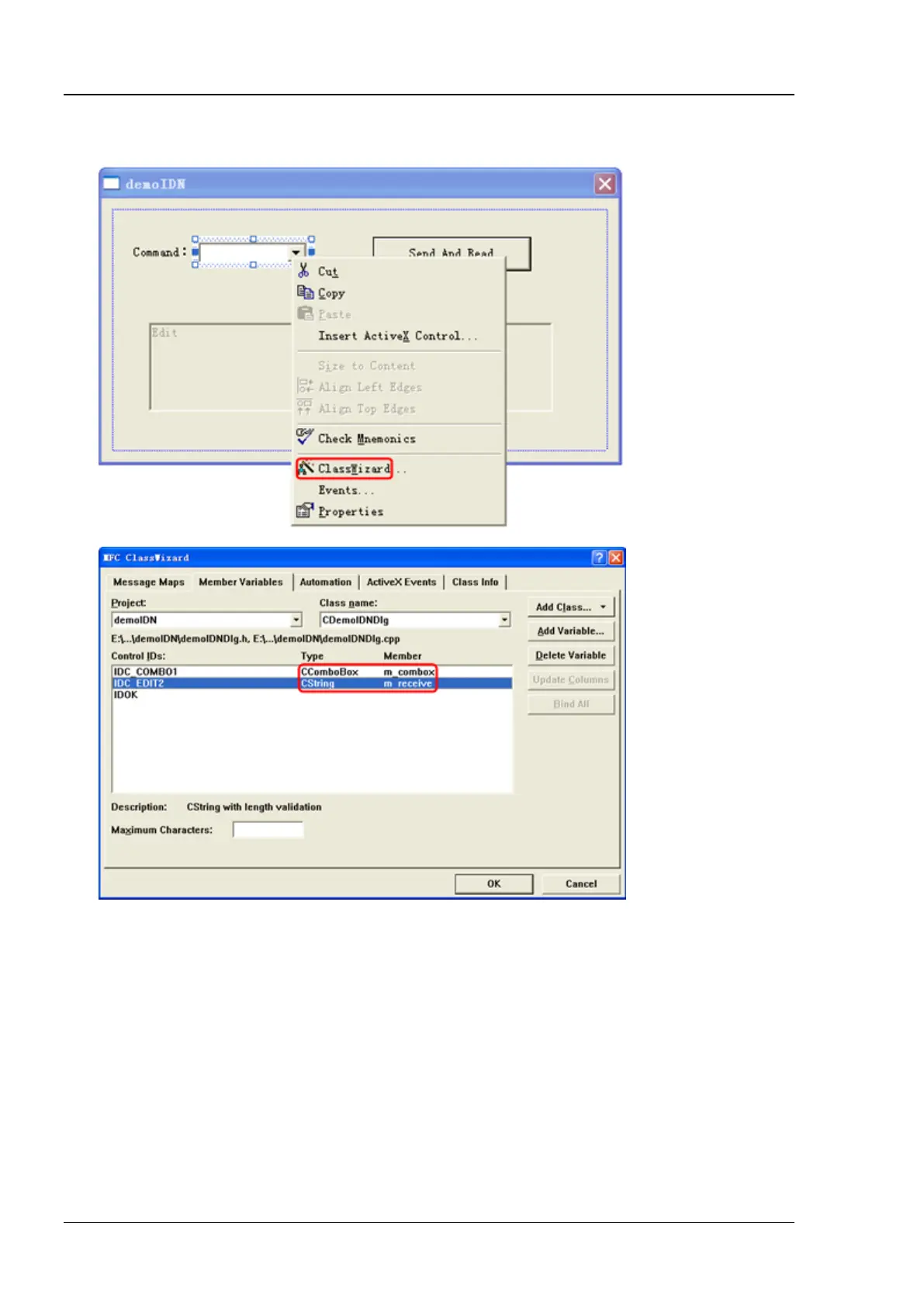 7. Add the variables m_combox and m_receive to the Combo Box and Edit Box controls