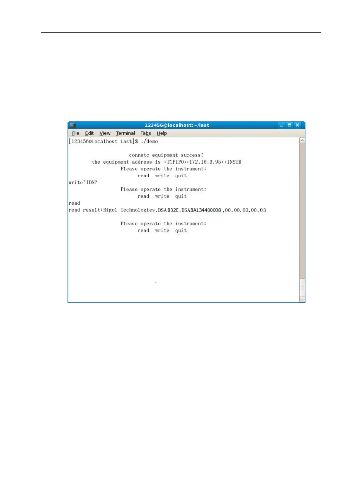 4) Input write<command> (for example, write<*IDN?>) to write the command into the