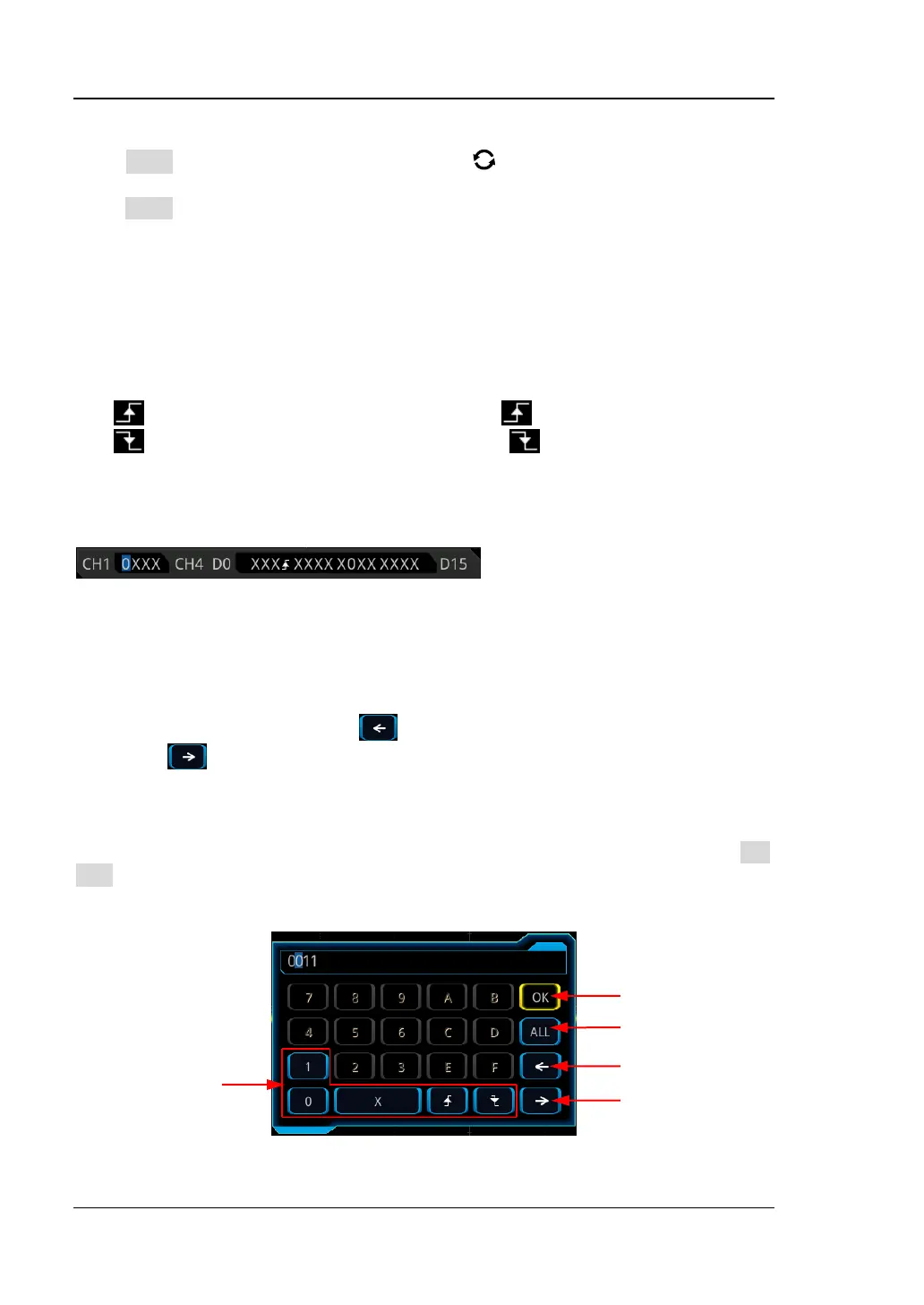 ⚫ Falling: sets the pattern to the falling edge ( ) of the channel selected.