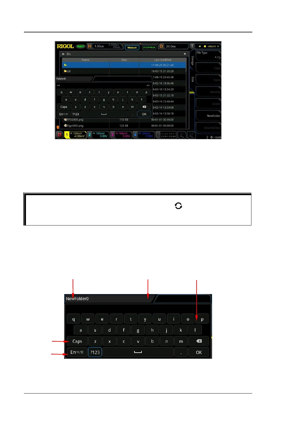 This oscilloscope supports Chinese/English input method. The length of the folder
