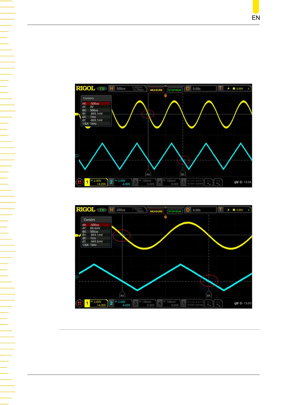 Measure the waveforms of CH1 and CH2 with Cursor A and Cursor B, respectively.