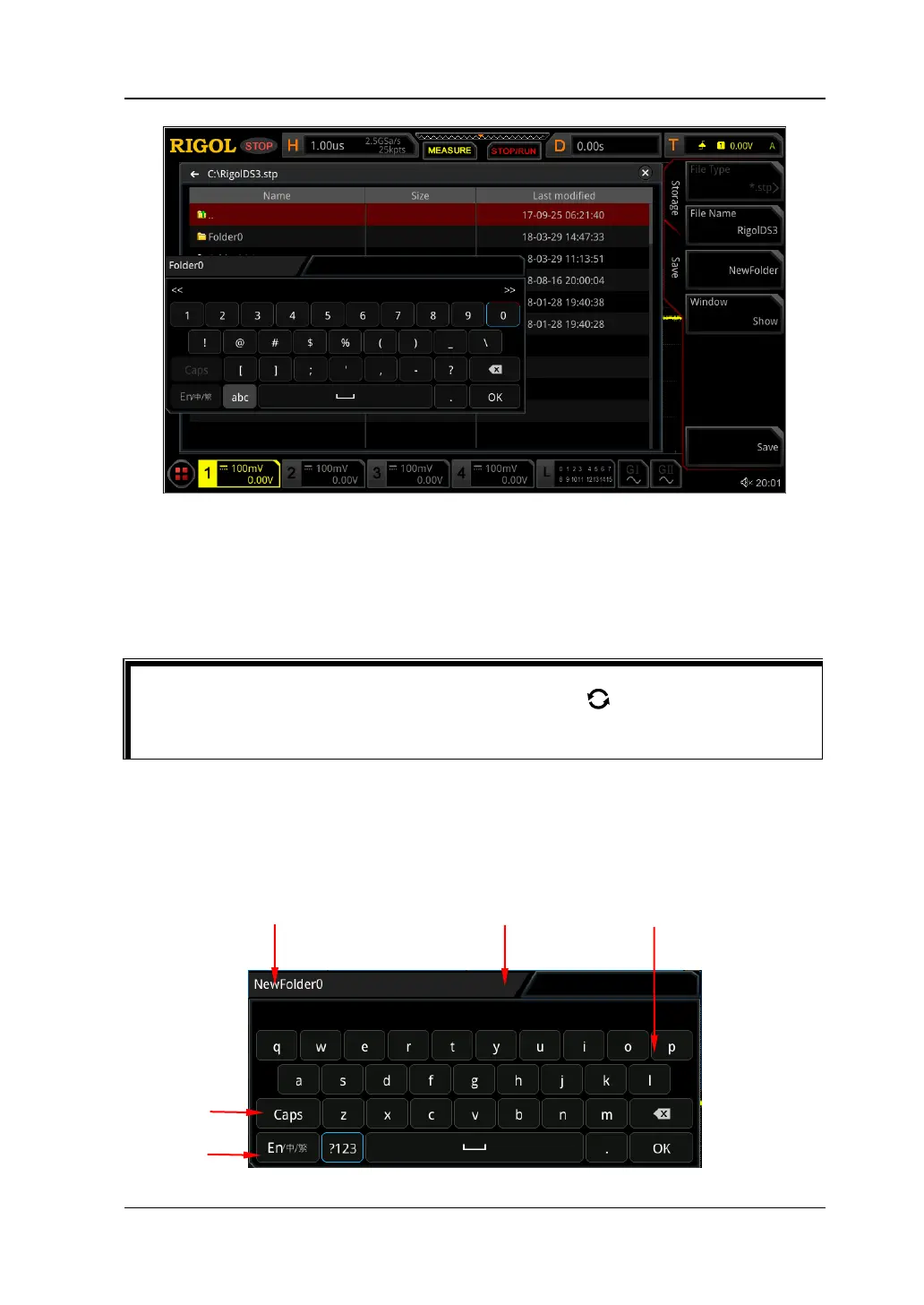 This oscilloscope supports Chinese/English input method. The length of the folder