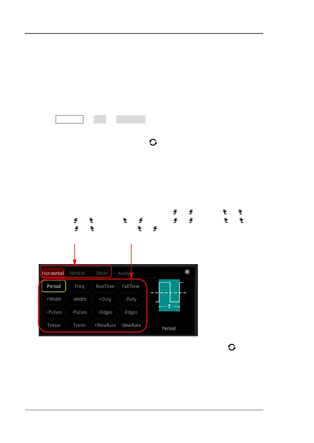 "Horizontal" measurement parameters: Period, Freq, RiseTime, FallTime,