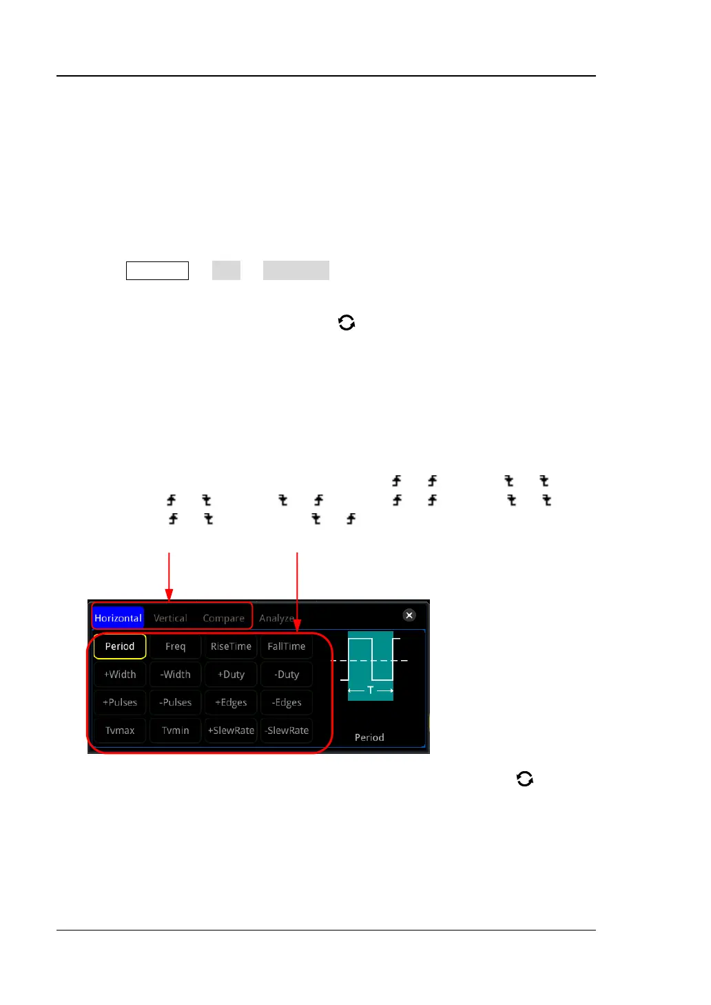 "Horizontal" measurement parameters: Period, Freq, RiseTime, FallTime,