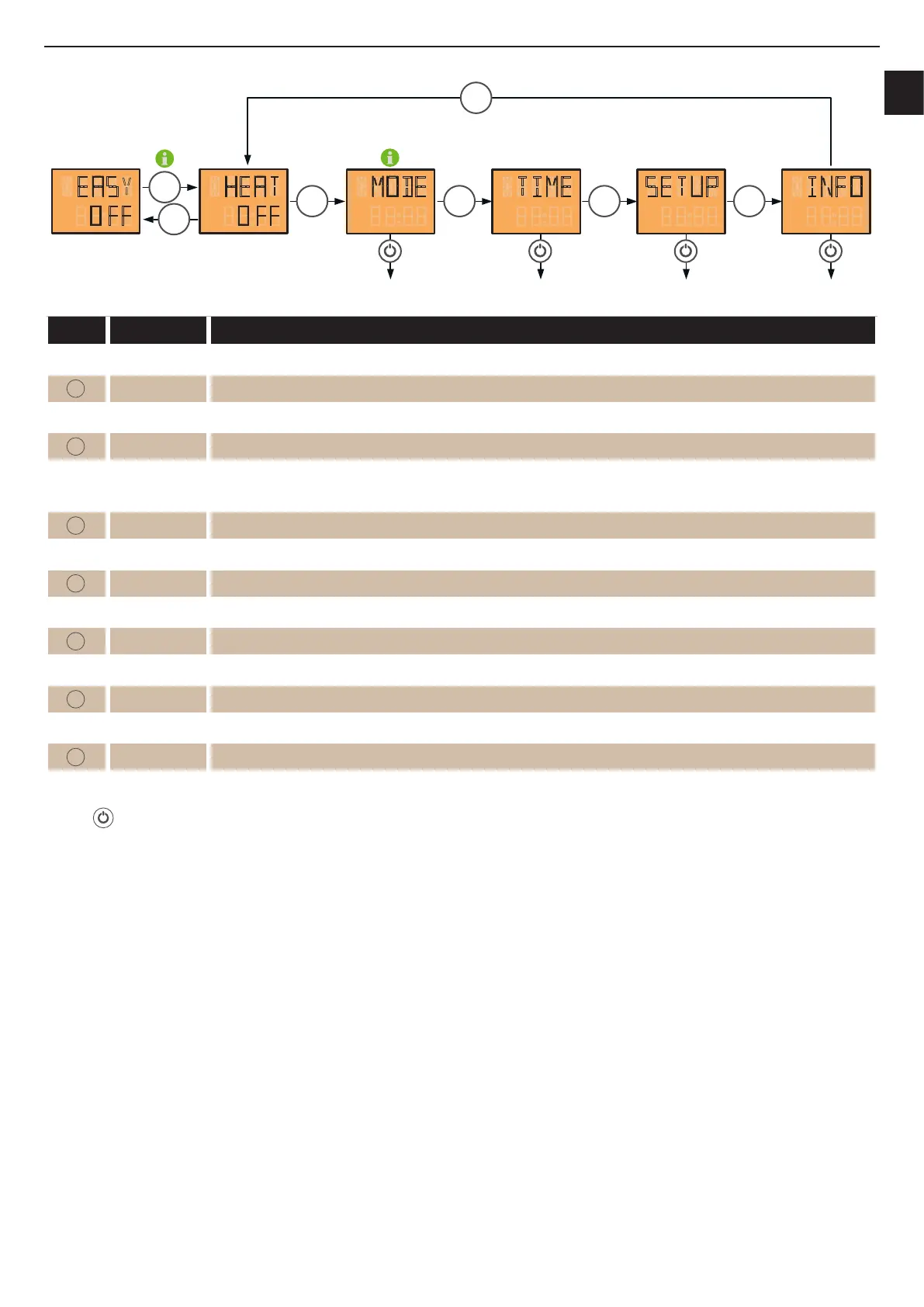The menu navigation described above remains the same during operation. The respective heat output set is shown in the display instead of EASY OFF or HEAT