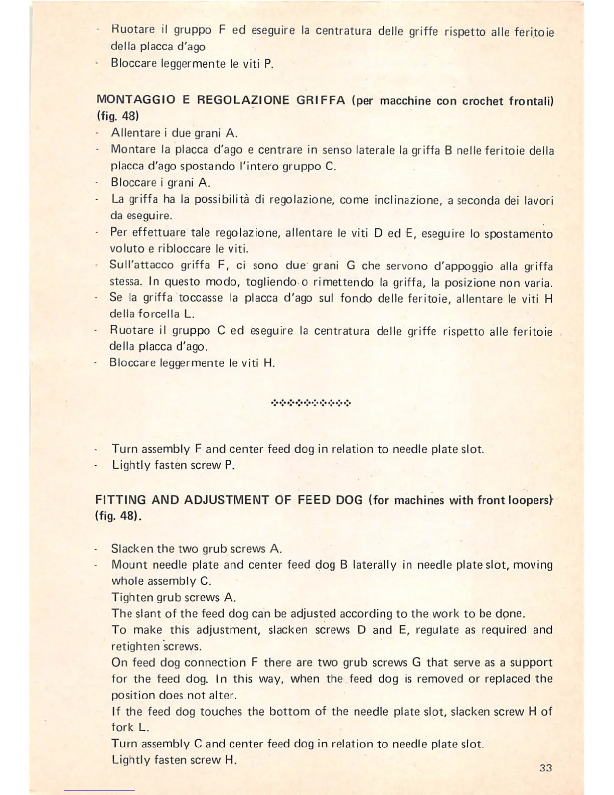 • Se la griffa toccasse la placca d'ago sul fondo detle feritoie, allentare le viti H