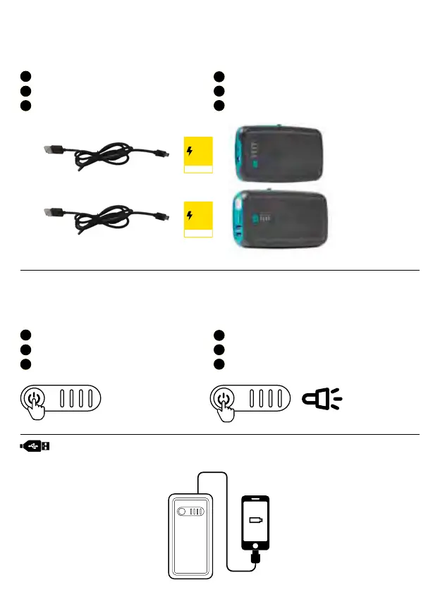Short press for power status and to enable USB output, long press for light (press again to cycle through continuous