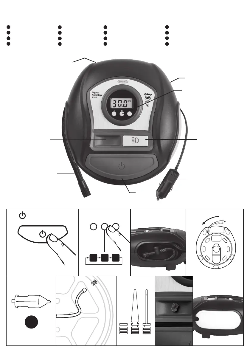 ring RTC450 - Control Layout; Power Button and Unit Selection Controls; Hose Connections and Storage Features; 12 V Power Plug and Accessories