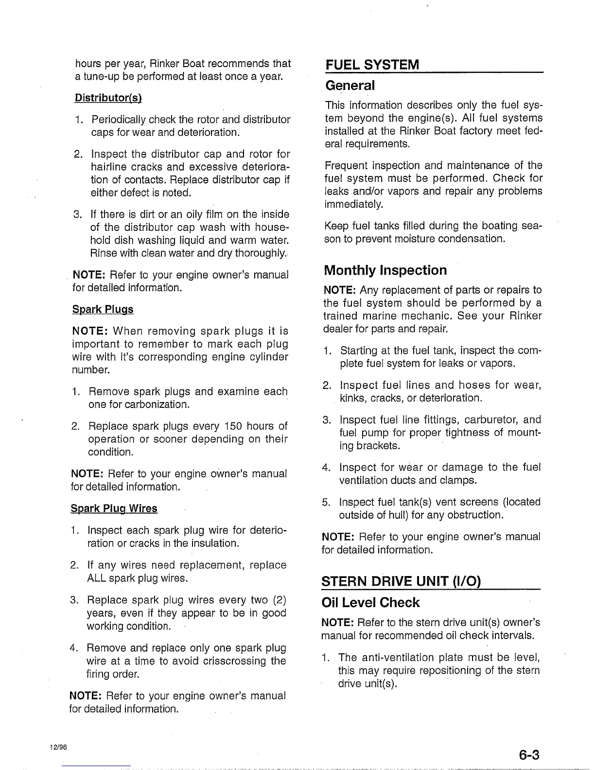 Rinker Cruisers - Fuel System; Stern Drive Unit (I;O); Monthly Inspection; Oil Level Check