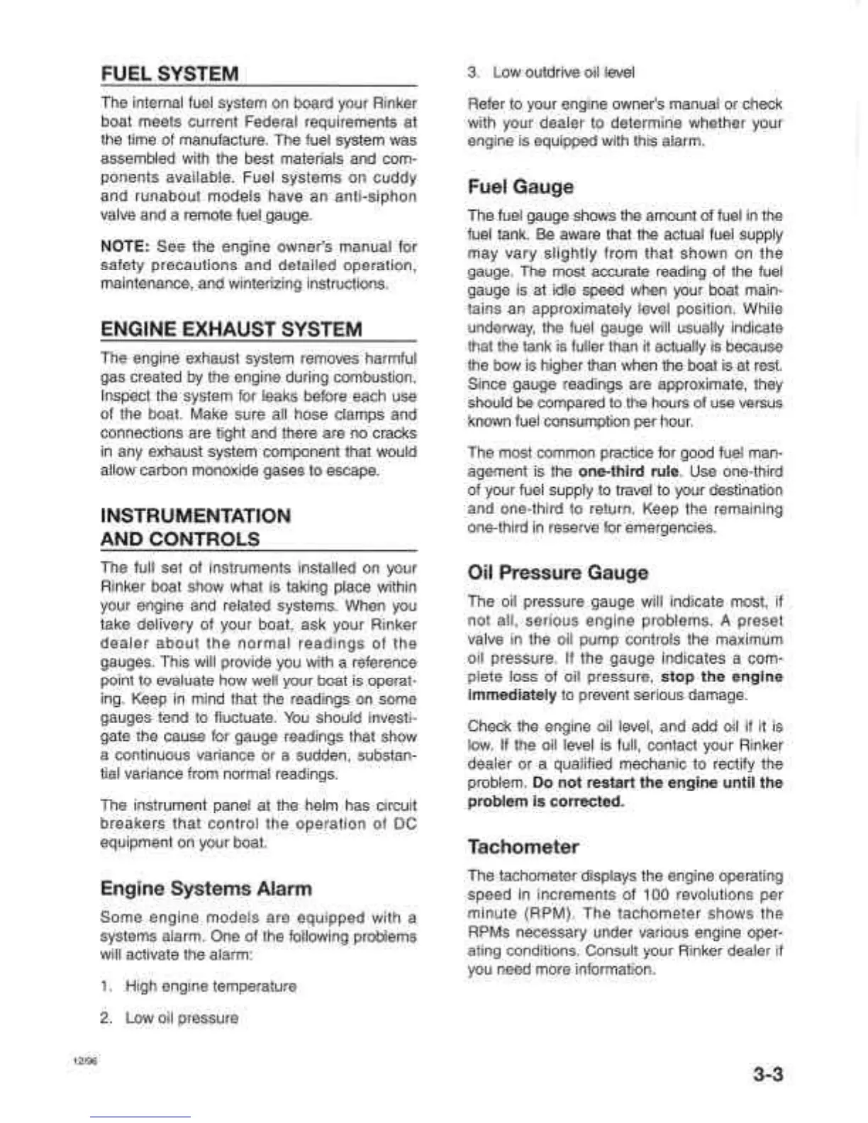 Rinker Runabouts - Fuel System; Engine Exhaust System; Instrumentation and Controls; Fuel Gauge