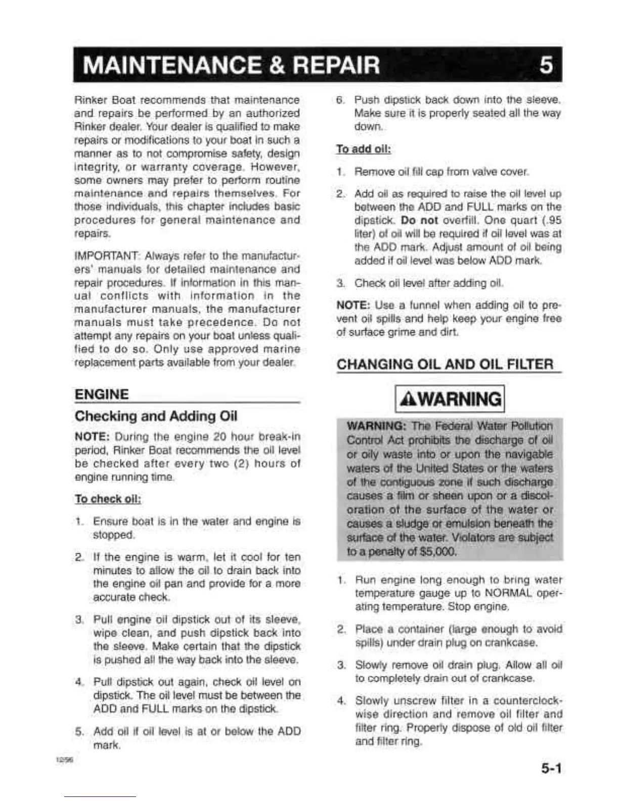 Rinker Runabouts - Maintenance & Repair; Engine; Changing Oil and Oil Filter; Checking and Adding Oil
