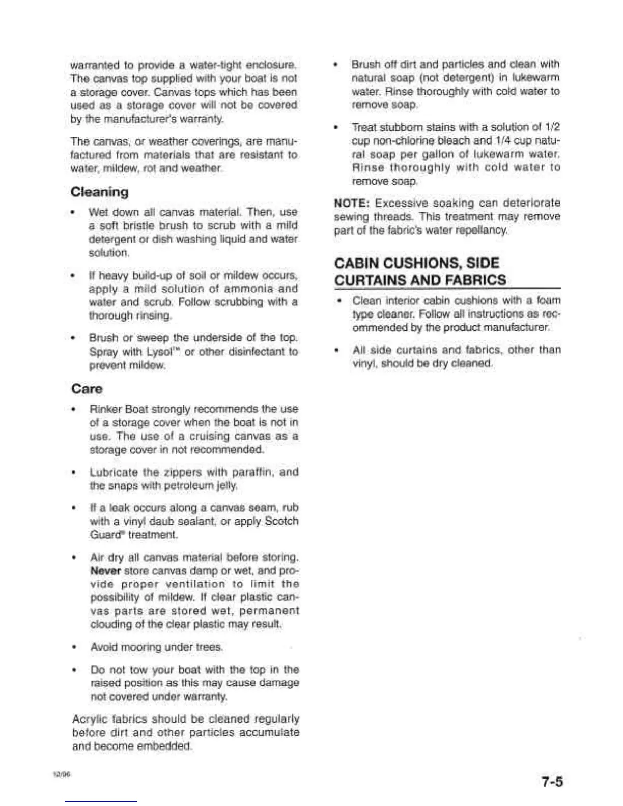 Rinker Runabouts - Cabin Cushions, Side Curtains and Fabrics; Cleaning; Care