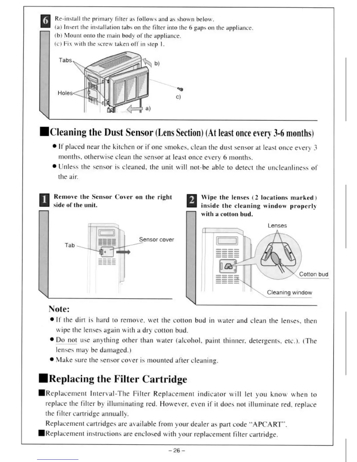 Rinnai 560 PTR - Cleaning the Dust Sensor (Lens Section); Replacing the Filter Cartridge