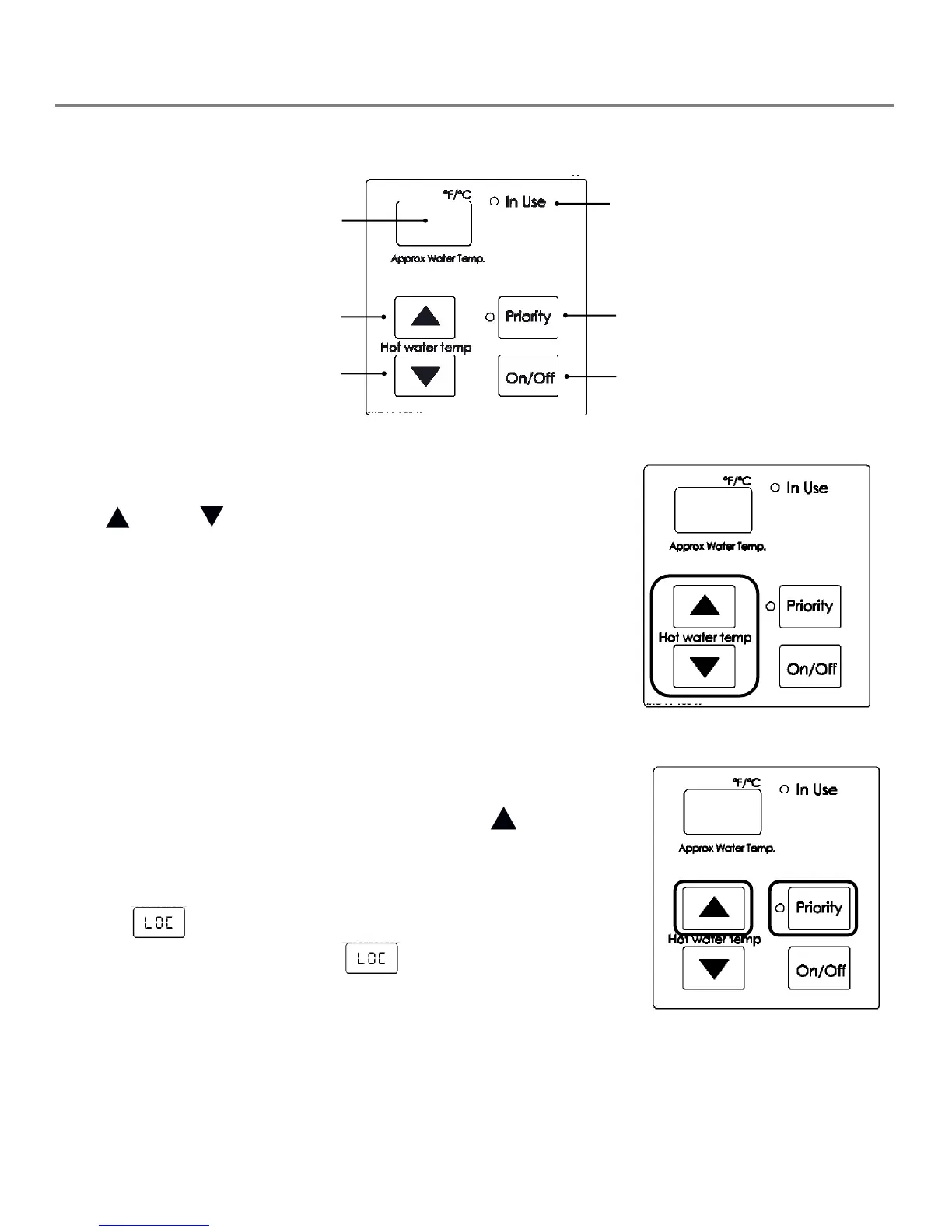 The controller panel allows you to adjust the water temperature, lock the controller on a set temperature, and view