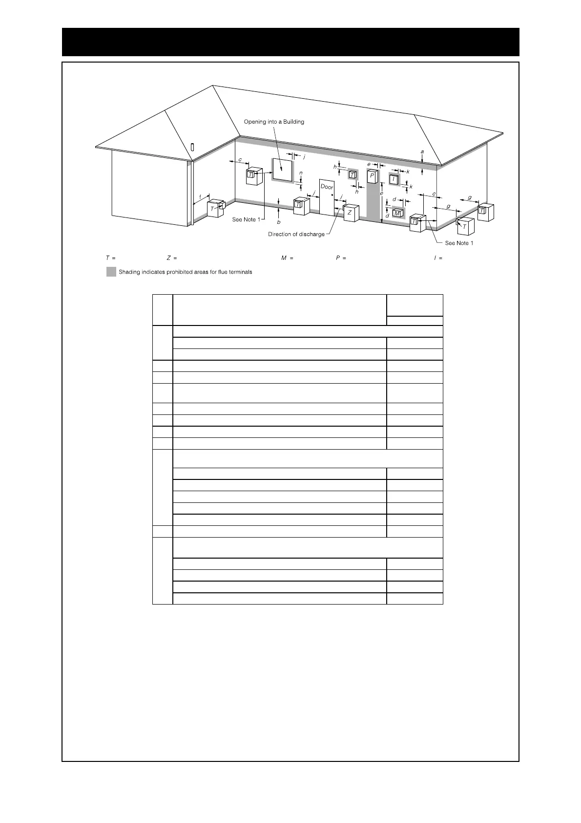 FIGURE 6.2 (in-part) MINIMUM CLEARANCES REQUIRED FOR FAN-ASSISTED FLUE TERMINALS, ROOM-