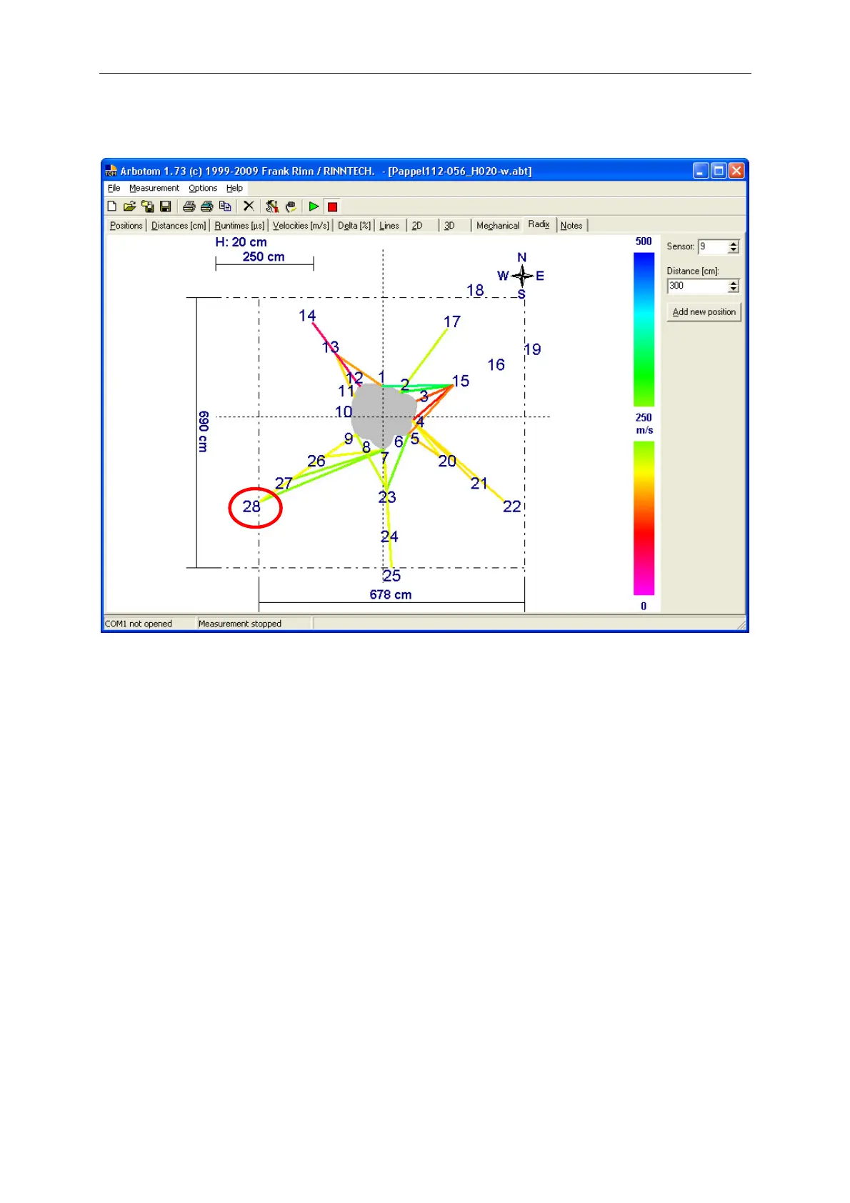Example: The measuring point 28 is in 300cm distance to sensor 9
