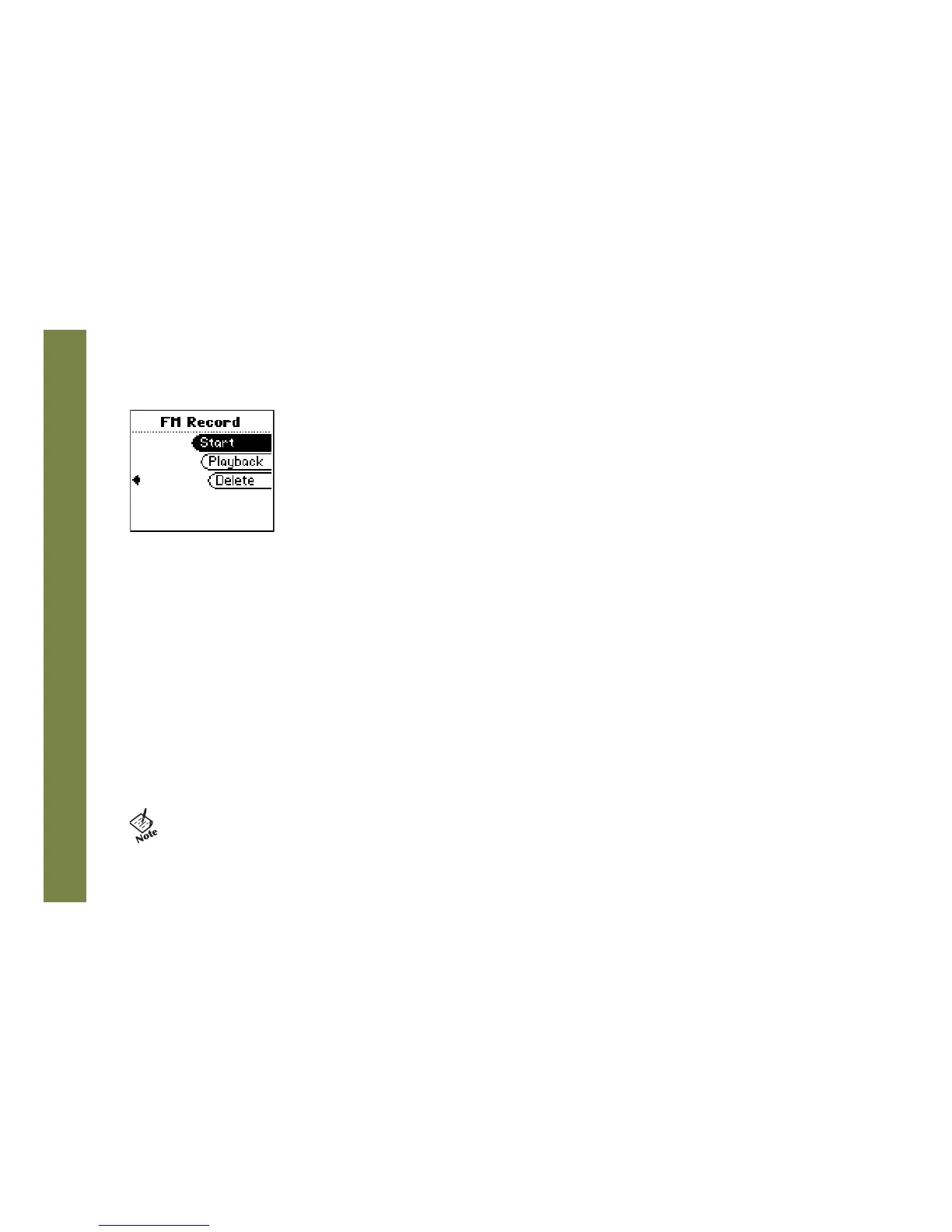 Select to begin recording. After recording has started, return to the FM Record menu and select the Stop