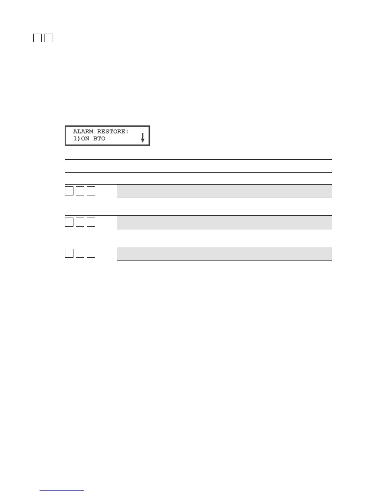 2 From the Dialer menu, press [8] to access the Alarm Restore menu options. The following
