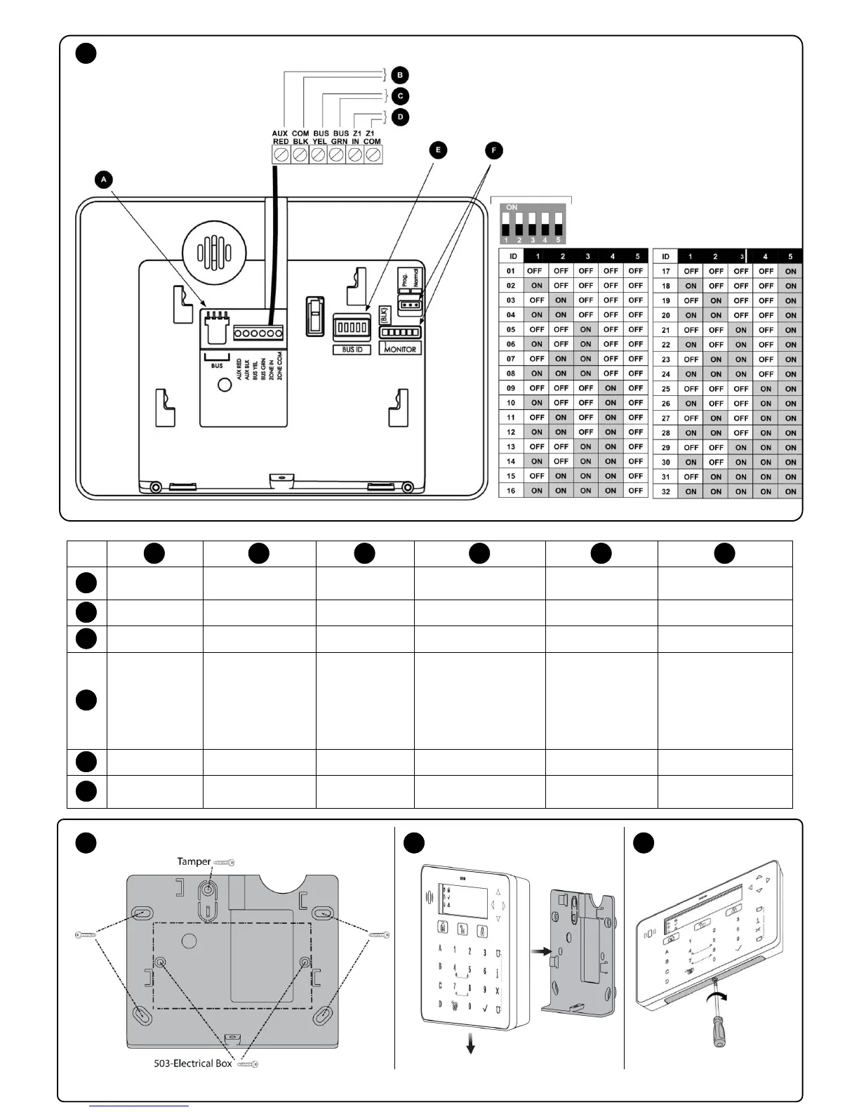 Risco RPKELP - Wiring and Connection Details; BUS Connector and Zone Information; DIP Switch Configuration; Keypad Mounting Instructions