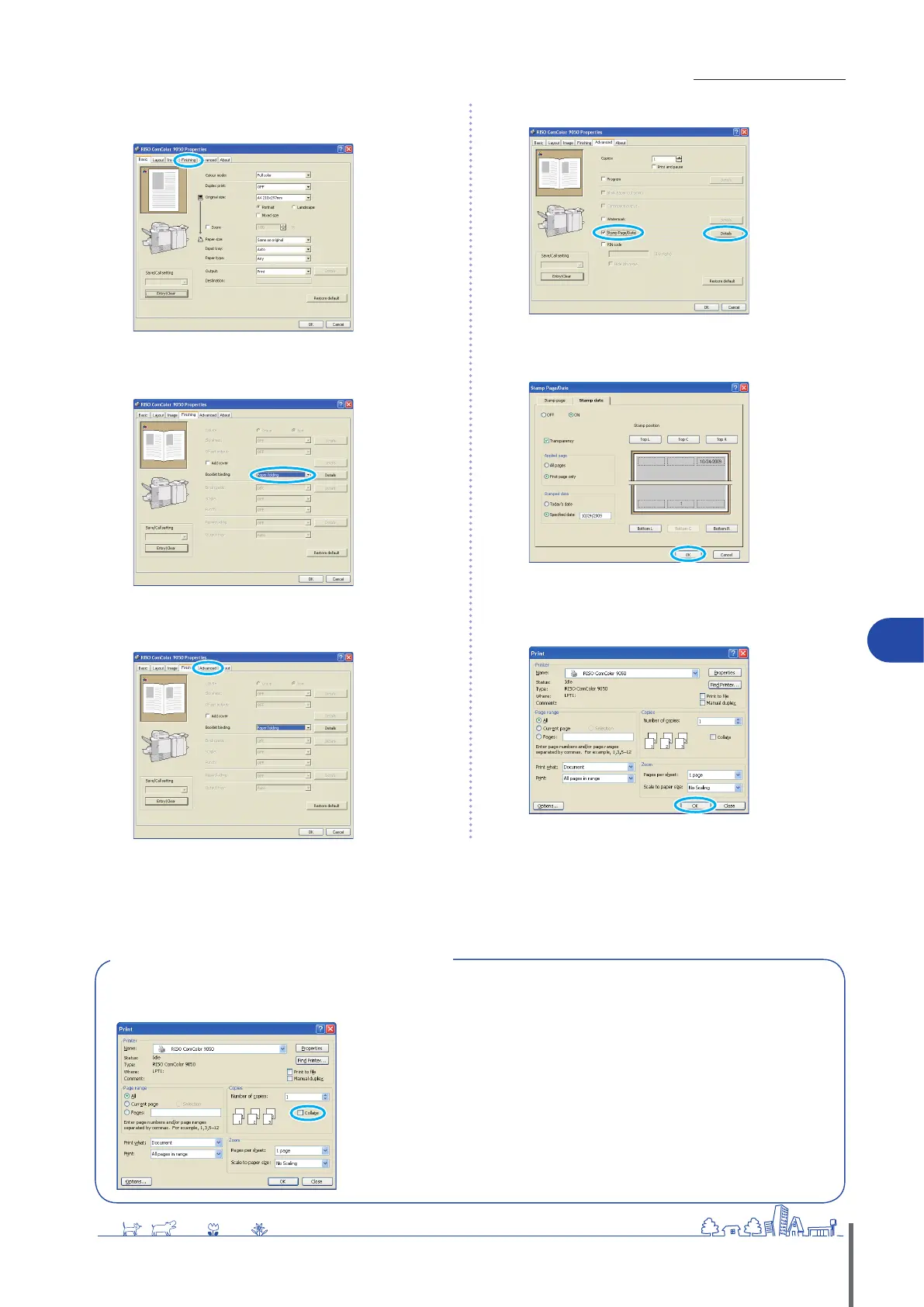 [Sort] in [Collate] on the [Finishing] tab for collated printing.