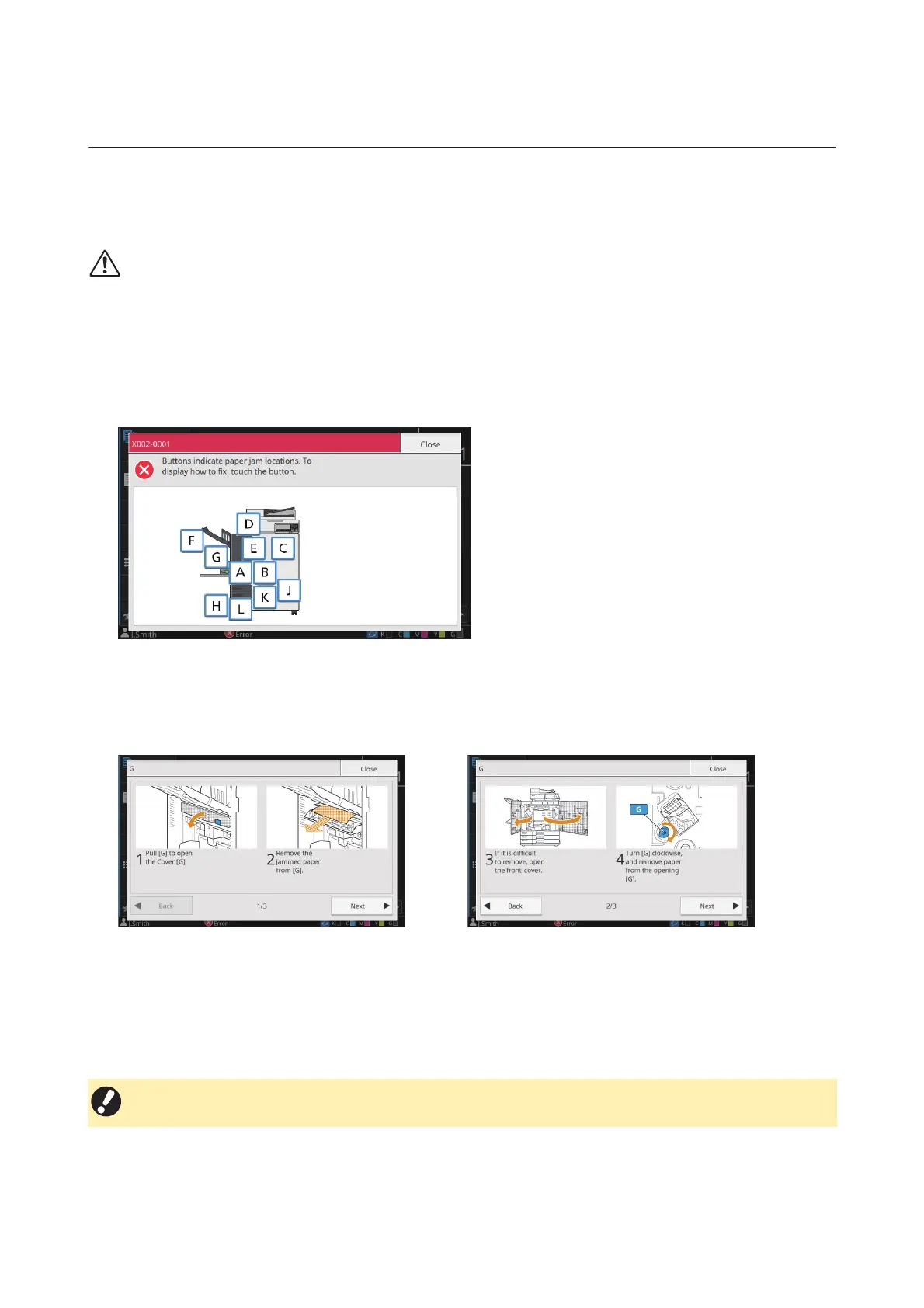 (The screenshots below are examples of the display when there is a paper jam.)