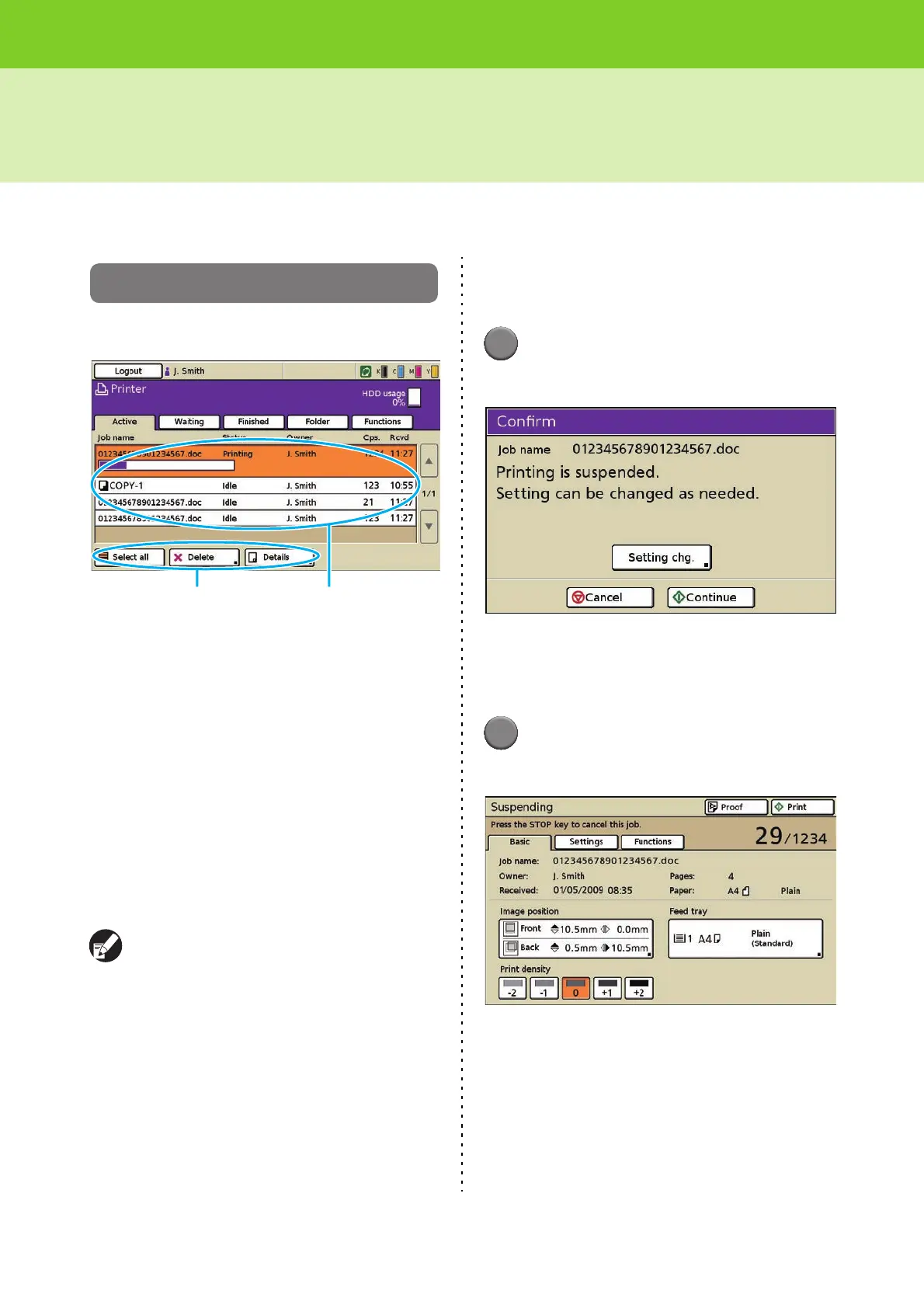 This section describes how to confirm details of, print, and delete jobs on the job list of each screen.