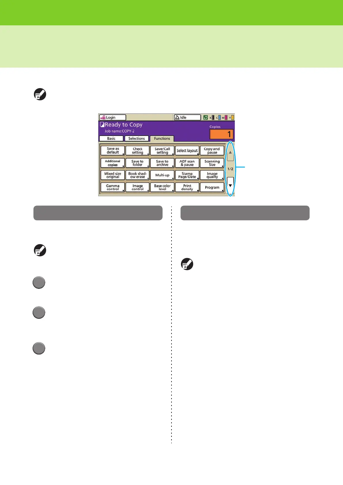 This section describes the copy functions that are configured with the [Functions] screen.