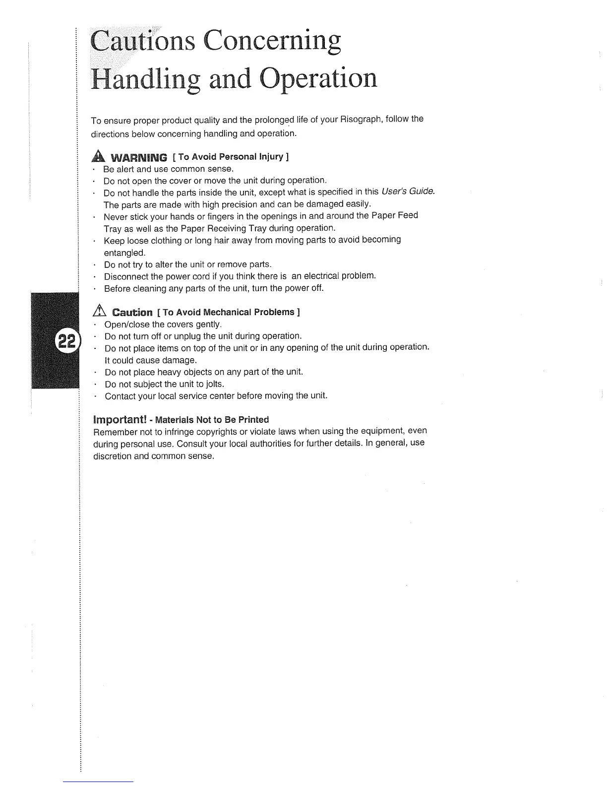 Riso GR3750 - Cautions Concerning Handling and Operation