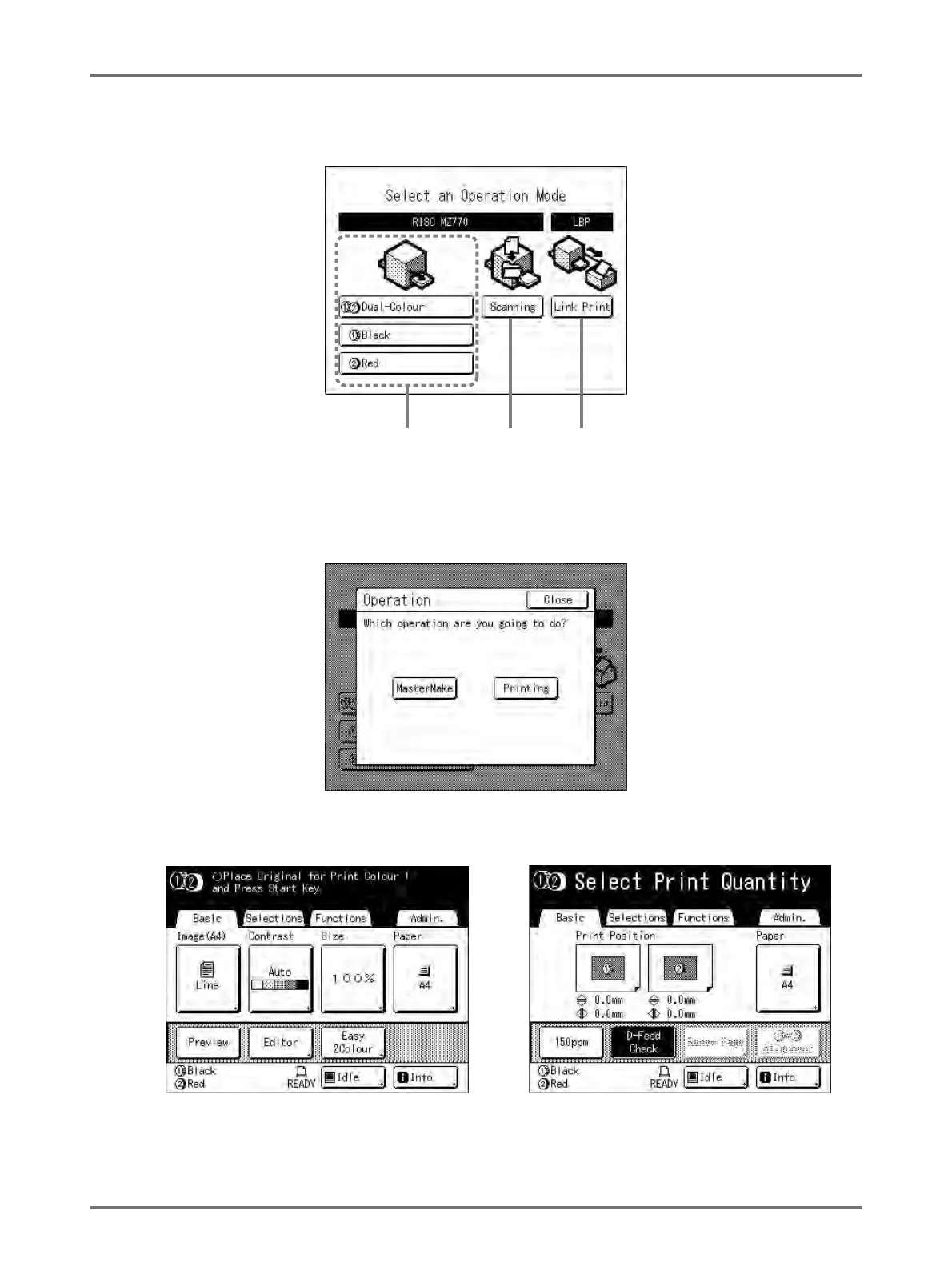 Select the print type (2-Colour Print/1-Colour Print (Drum 1 only or Drum 2 only)) to display the Operation Selec-