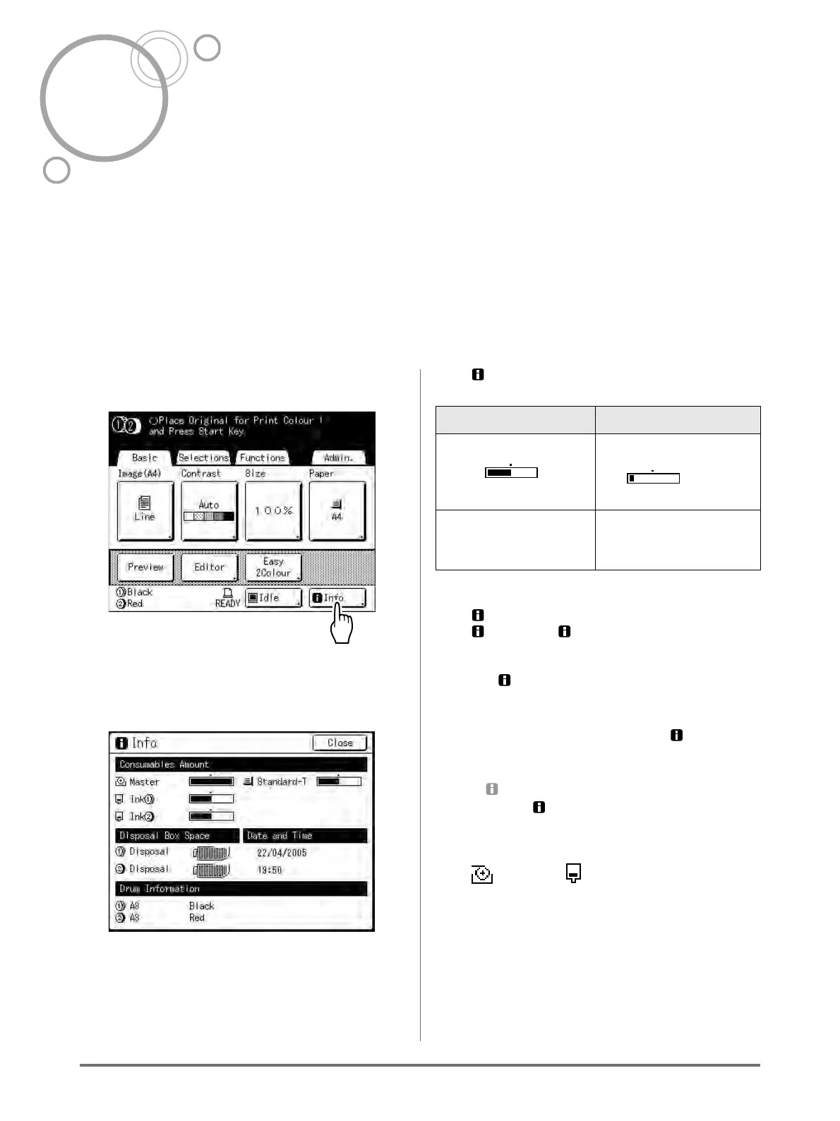 The machine checks and reports on remaining amount of ink, master, as well as the space left in the disposal box.