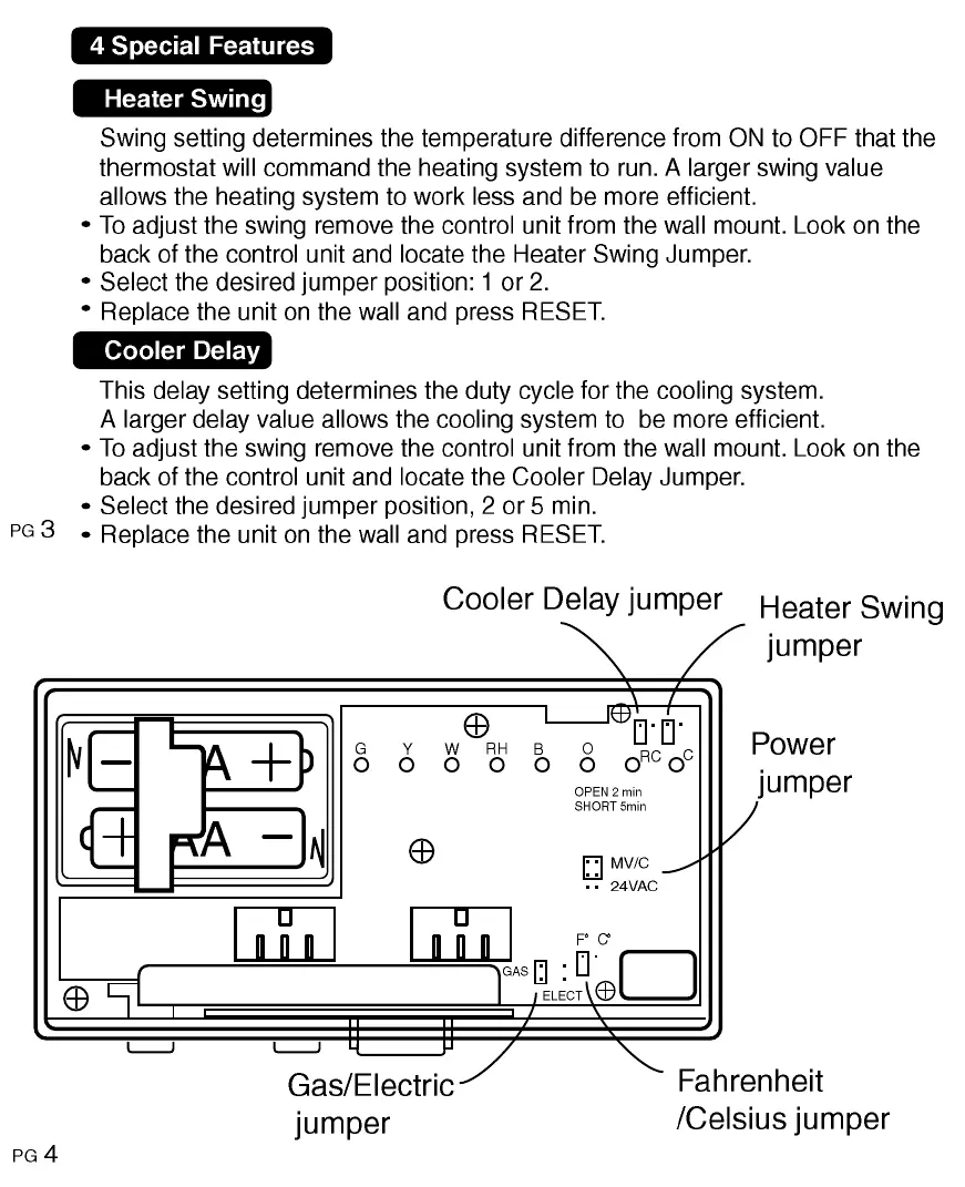 ritetemp 8029 - Advanced Features; Heater Swing Adjustment; Cooler Delay Configuration
