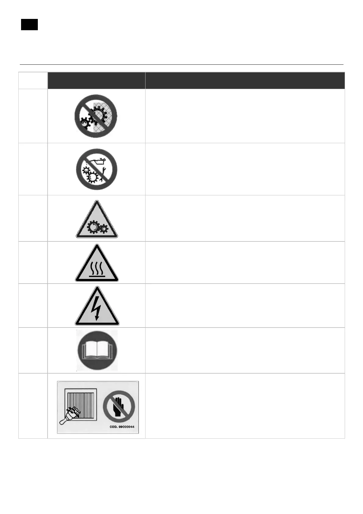 Table 4 – Description of the signaling labels present on the machine.