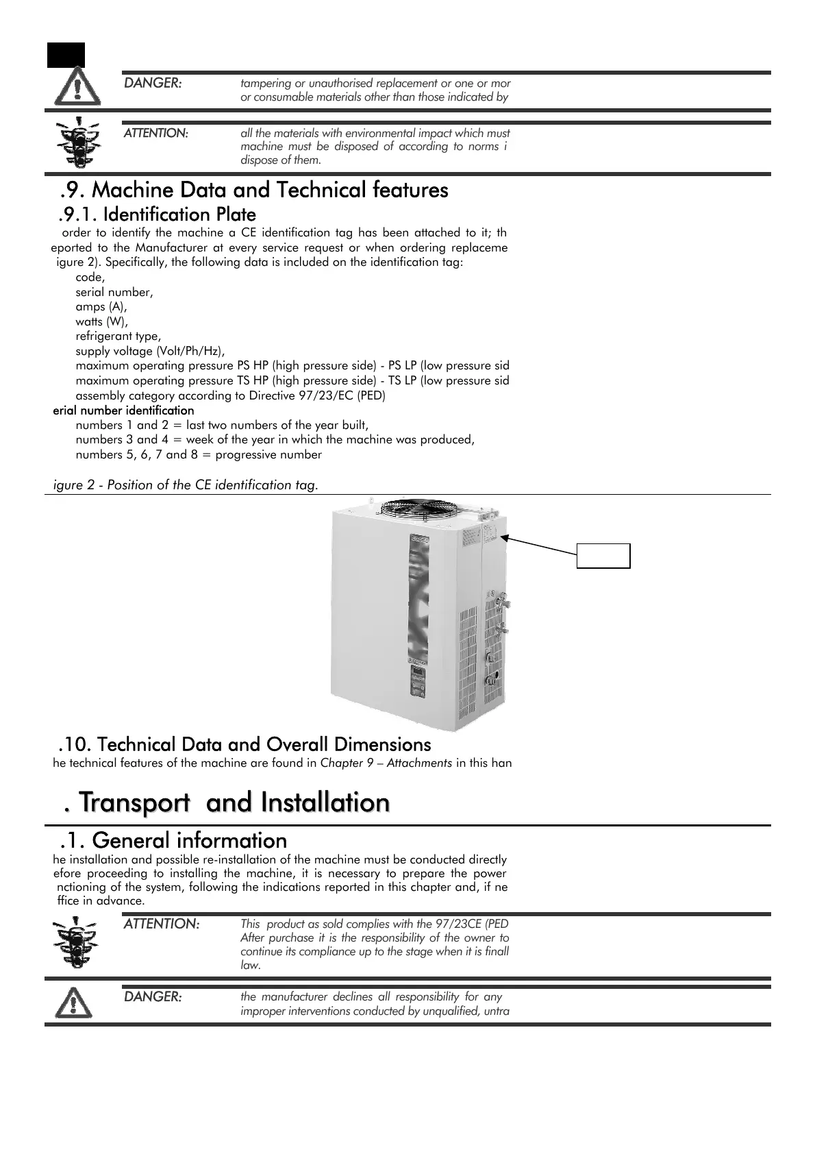 In order to identify the machine a CE identification tag has been attached to it; the identifying data included on this tag must be