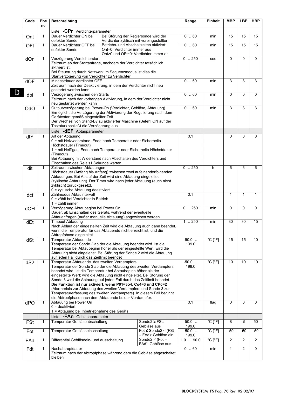 Liste -dEF Abtauparameter