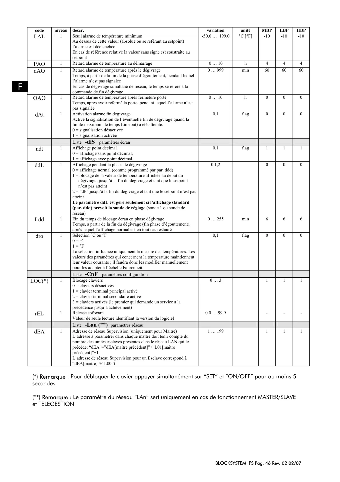 2 = “dF” jusqu’à la fin du dégivrage et tant que le setpoint n’est pas
