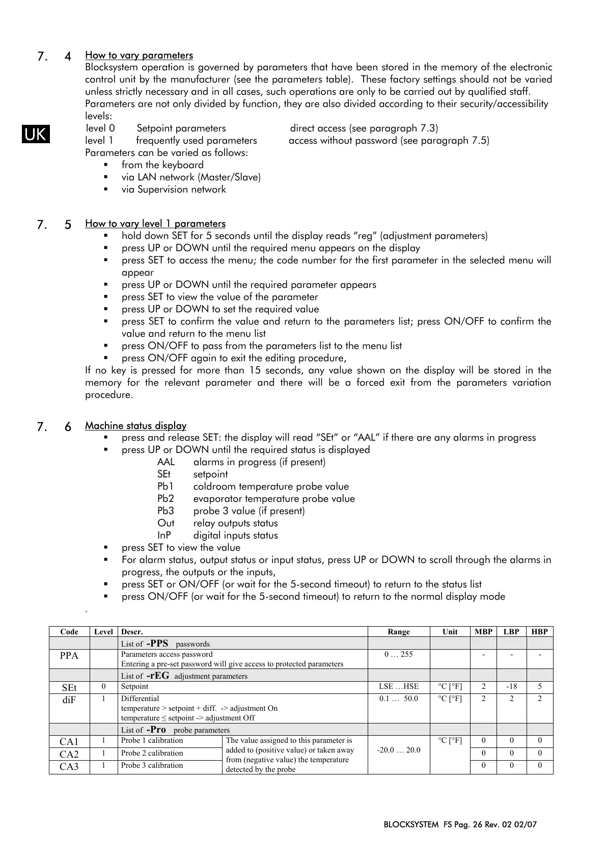 level 0 Setpoint parameters direct access (see paragraph 7.3)