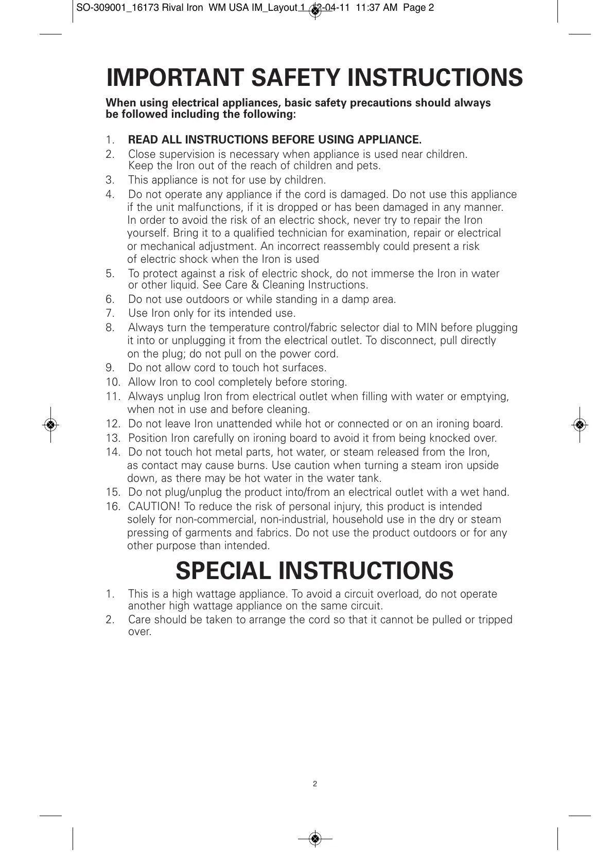 12. Do not leave Iron unattended while hot or connected or on an ironing board.