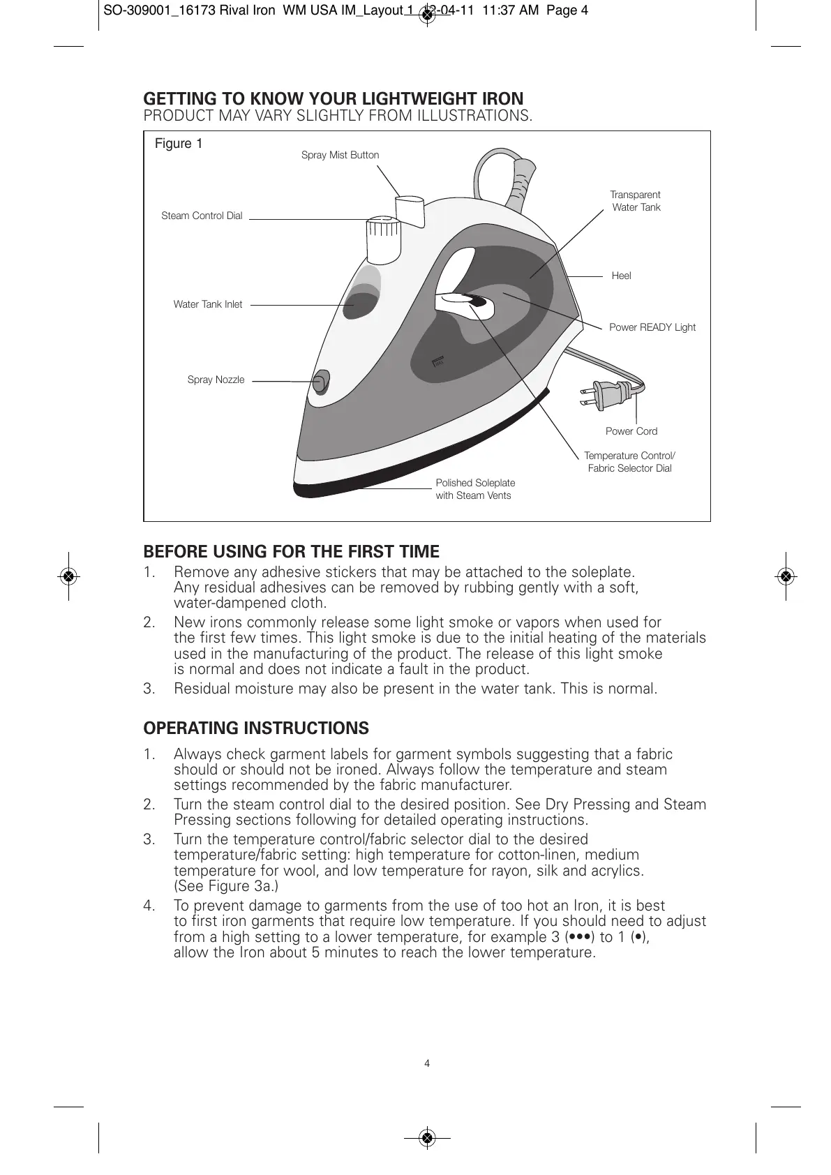 Rival 16173 - GETTING TO KNOW YOUR LIGHTWEIGHT IRON; BEFORE USING FOR THE FIRST TIME; OPERATING INSTRUCTIONS