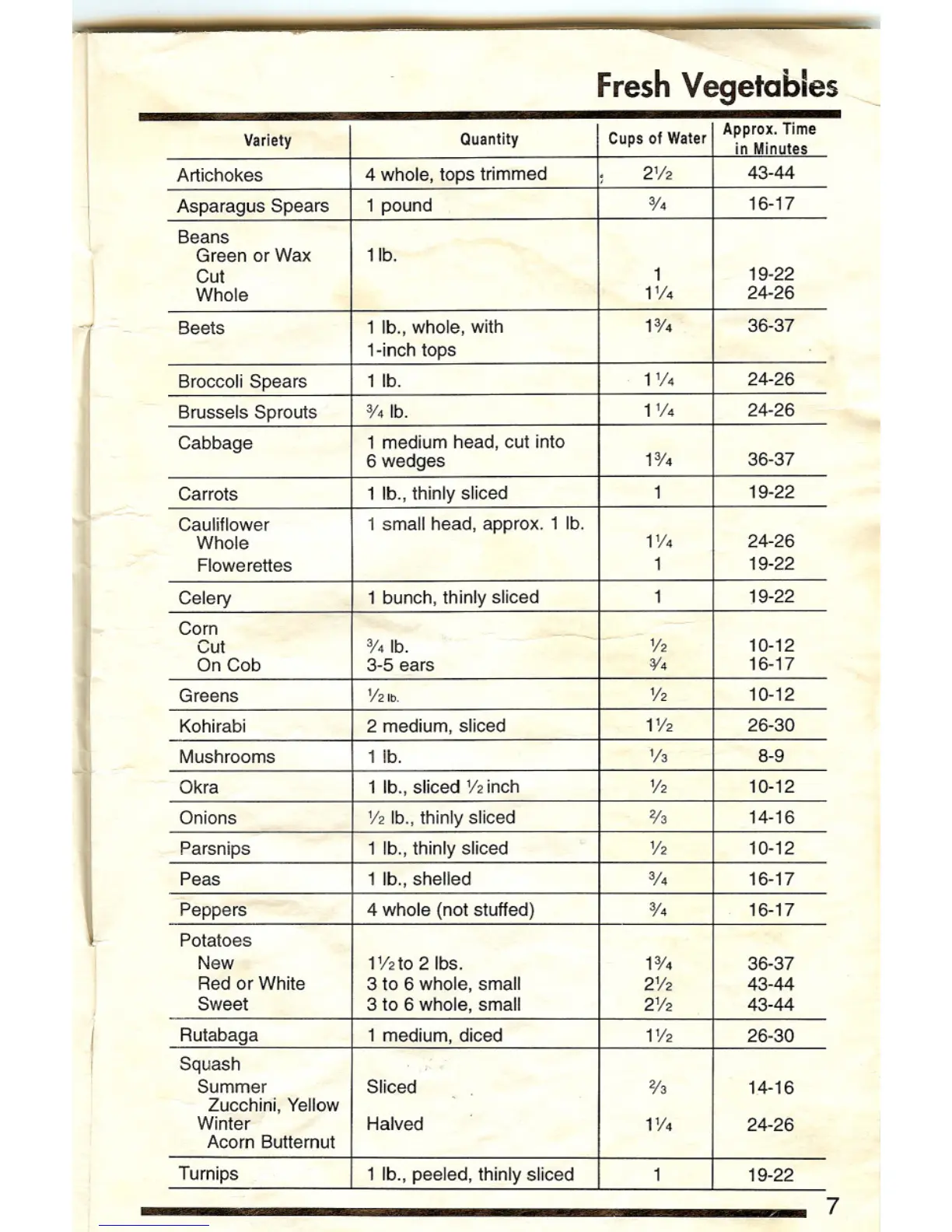 Rival 4450 - Fresh Vegetable Steaming Guide; Cooking Times for Fresh Vegetables