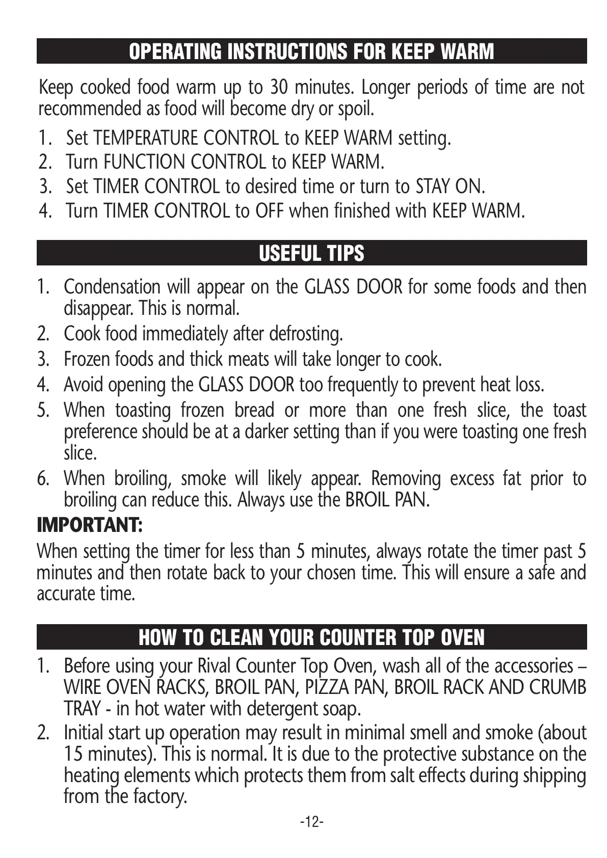 OPERATING INSTRUCTIONS FOR KEEP WARM