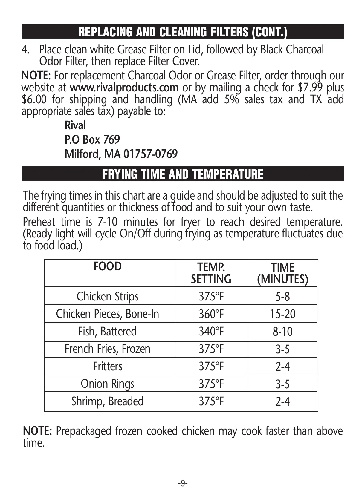 website at www.rivalproducts.com or by mailing a check for $7.99 plus