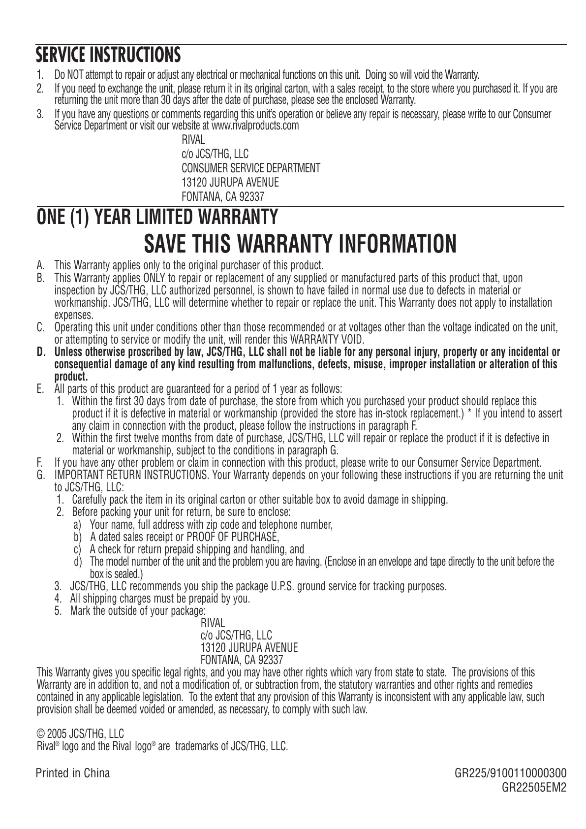2. Within the first twelve months from date of purchase, JCS/THG, LLC will repair or replace the product if it is defective in