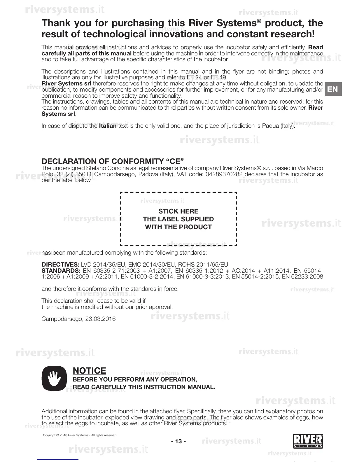 The undersigned Stefano Concina as legal representative of company River Systems® s.r.l. based in Via Marco