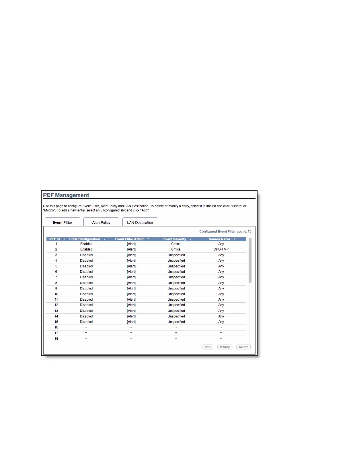 You can use the Configuration > PEF page to manage the Platform Event Filtering settings. You can