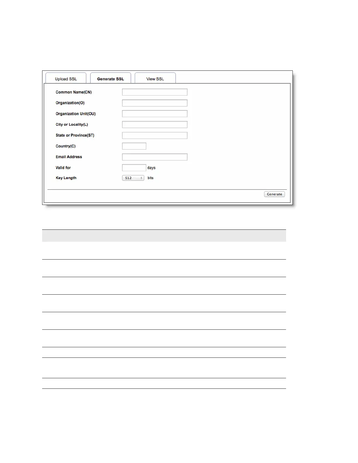 1. Choose Configuration > SSL and select the Generate SSL tab.