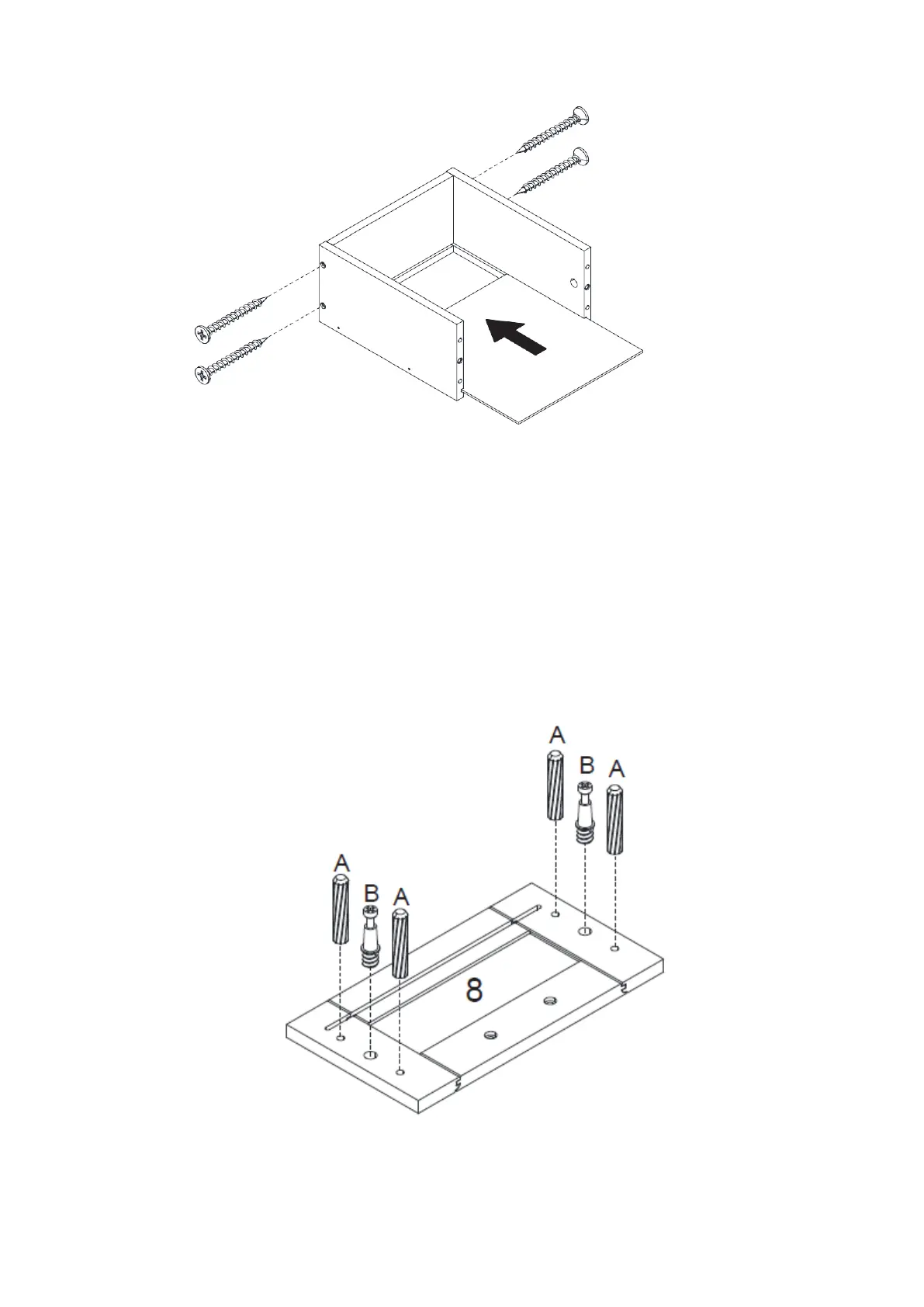 1. Screw 2 cam bolts (B) into pre-threaded holes on drawer front board (8).