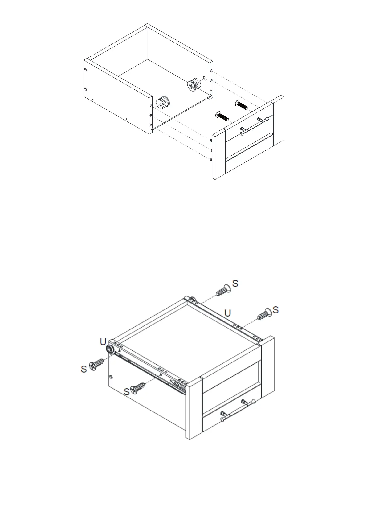 2. Attach drawer slides (attach to drawer-U) to drawer right side panel (10) by inserting 2 wood screws (S) through