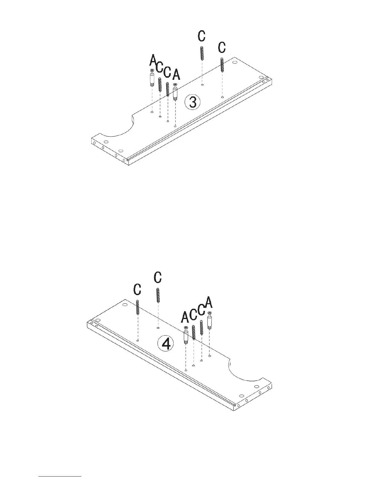 2.Insert 4 wood dowels (C) into the dowel holes on the top left side panel (3).