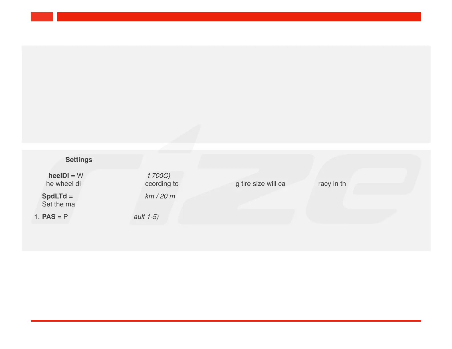 The wheel diameter must be set according to the tire size. Wrong tire size will cause inaccuracy in the speed readout.