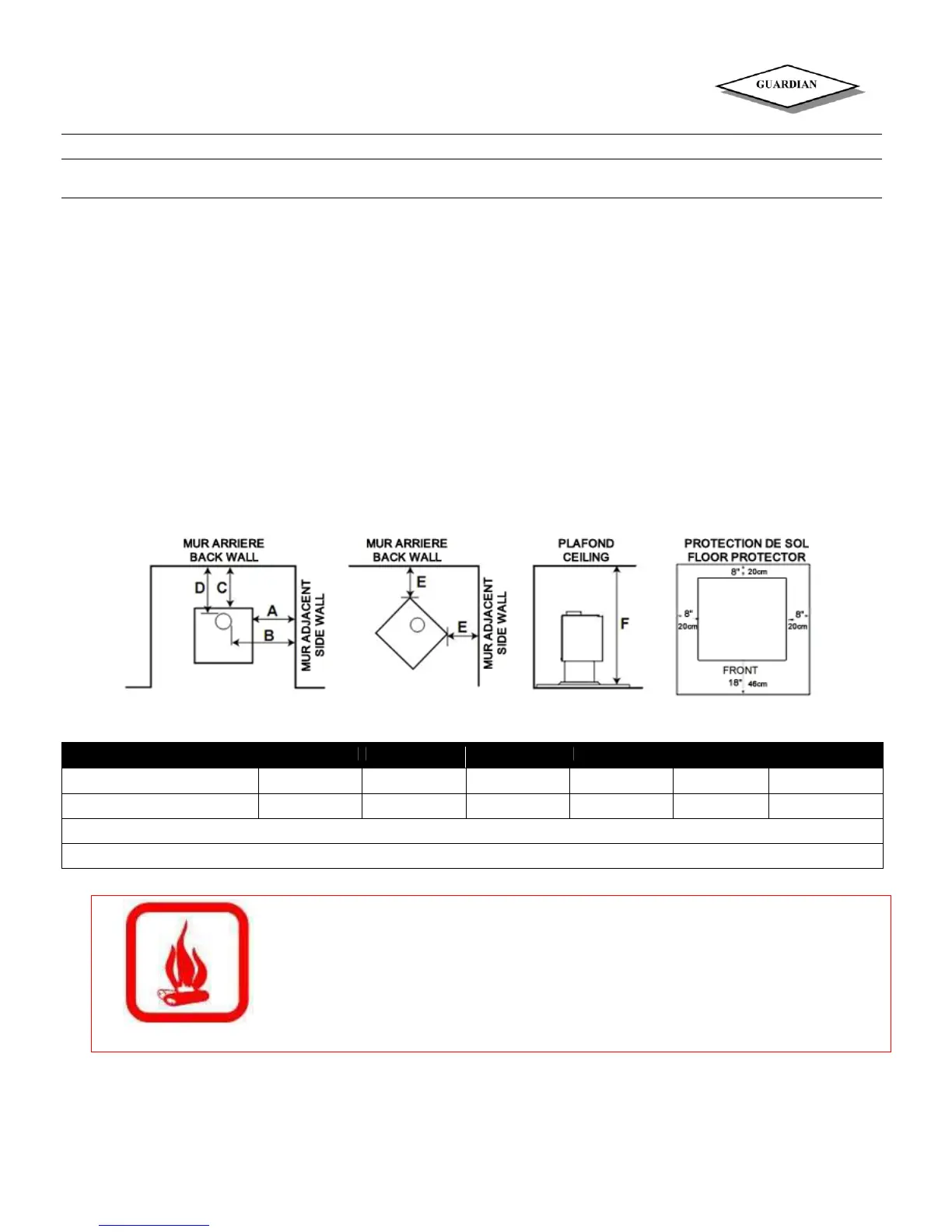 Floor / Ember protector minimum extension on: sides and back 8”(20cm) ; front 18”(46cm)